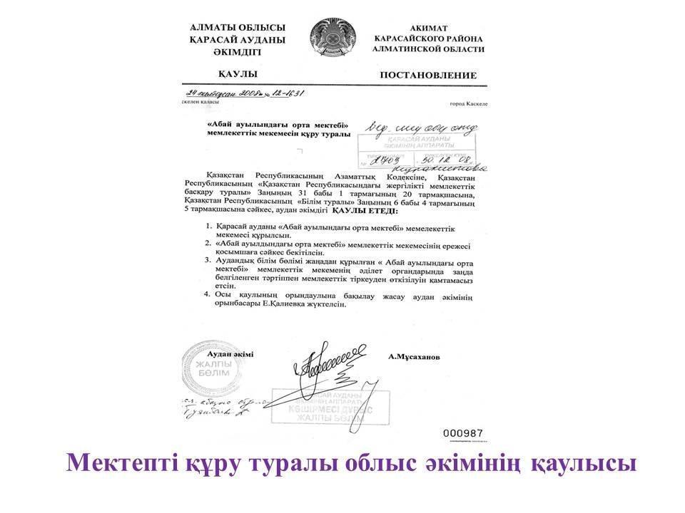 Мектепті құру туралы облыс әкімінің қаулысы » Алматы облысы Қарасай ауданы "Абай ауылындағы орта мектебі"КММ