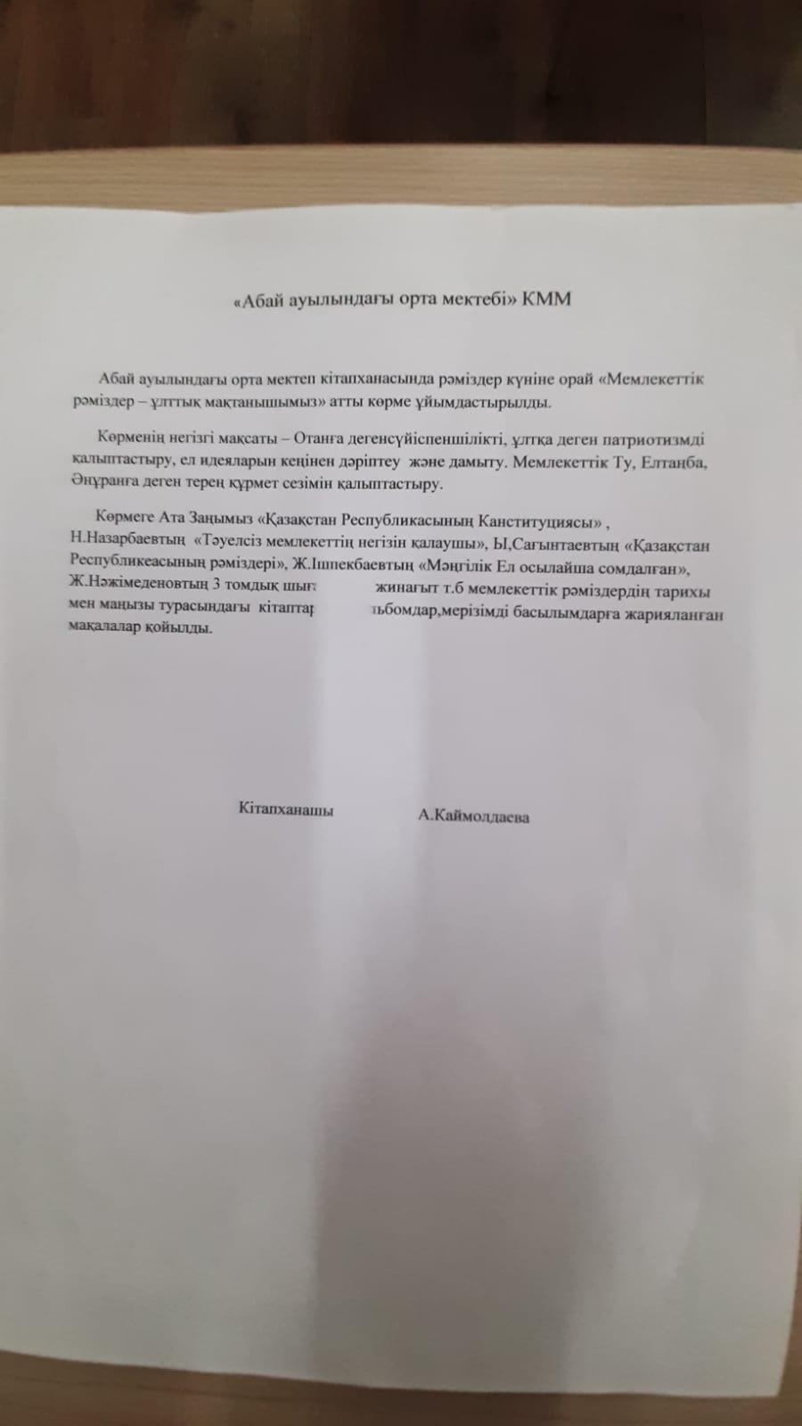 Мемлекеттік рәміздер-ұлт мақтанышы » Алматы облысы Қарасай ауданы "Абай ауылындағы орта мектебі"КММ