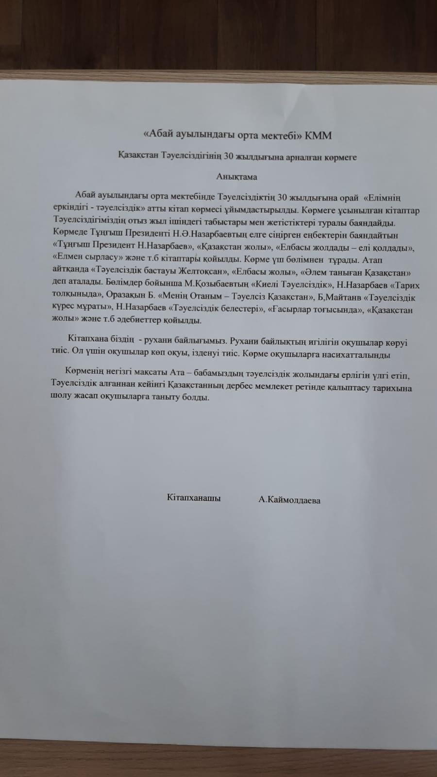 Қазақстан тәуелсіздігінің 30 жылдығына арналған көрме » Алматы облысы Қарасай ауданы "Абай ауылындағы орта мектебі"КММ