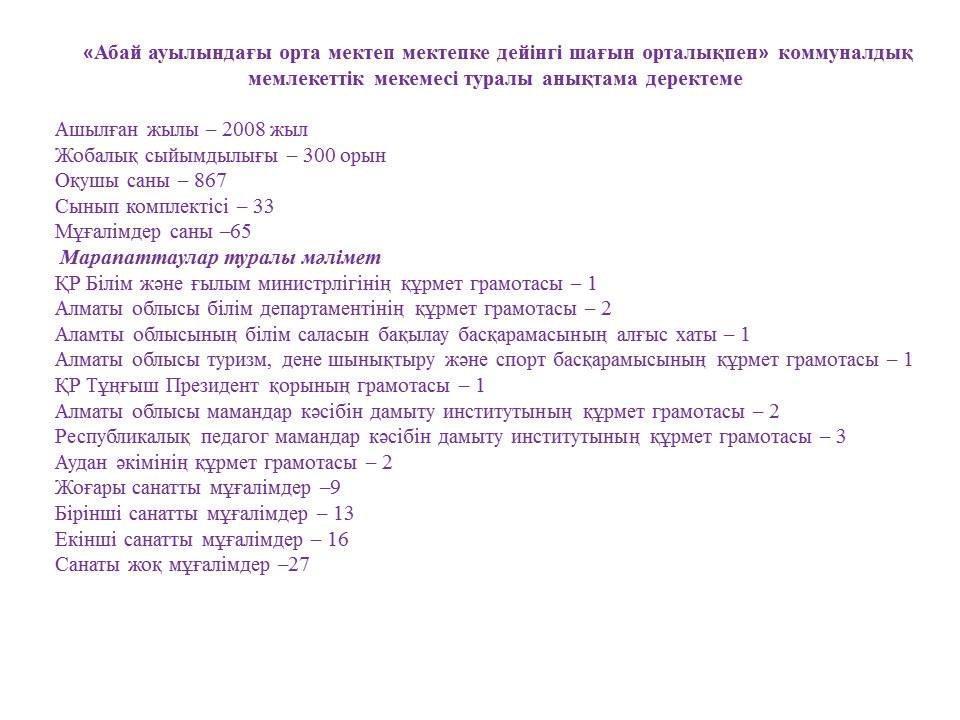 Мектеп-білім бұлағы » Алматы облысы Қарасай ауданы "Абай ауылындағы орта мектебі"КММ