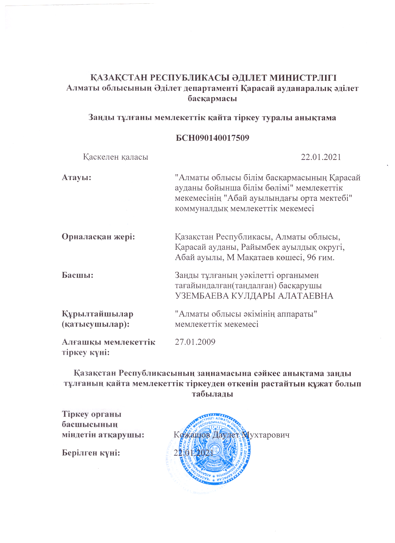 Нормативтік құжаттар » Алматы облысы Қарасай ауданы "Абай ауылындағы орта мектебі"КММ