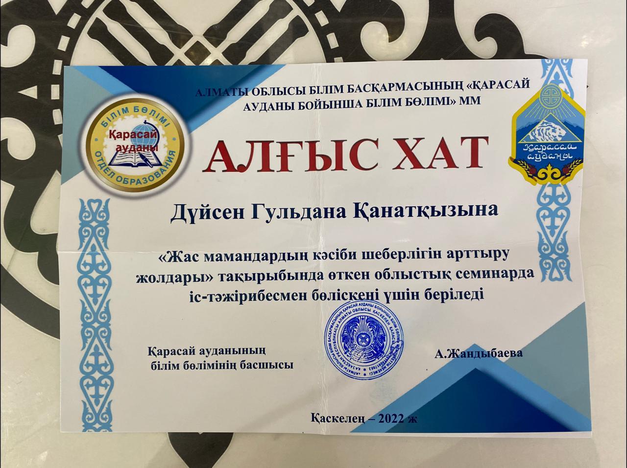 22 апрель 2022 0 1 2 3 4 5 "Жас мамандардың кәсіби шеберлігін арттыру жолдары " тақырыбында өткен облыстық семинарда іс-тәжірибесмен бөліскені үшін беріледі.