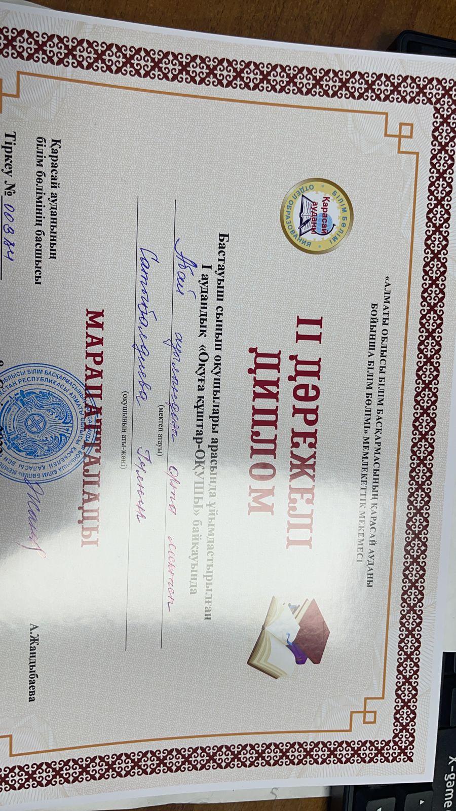 29 апрель 2022 0 1 2 3 4 5 Бастауыш сынып оқушылары арасында ұйымдастырылған І аудандық "Оқуға құштар-Оқушы"байқауында Сатыбалдиева Гүлнар марапатталады