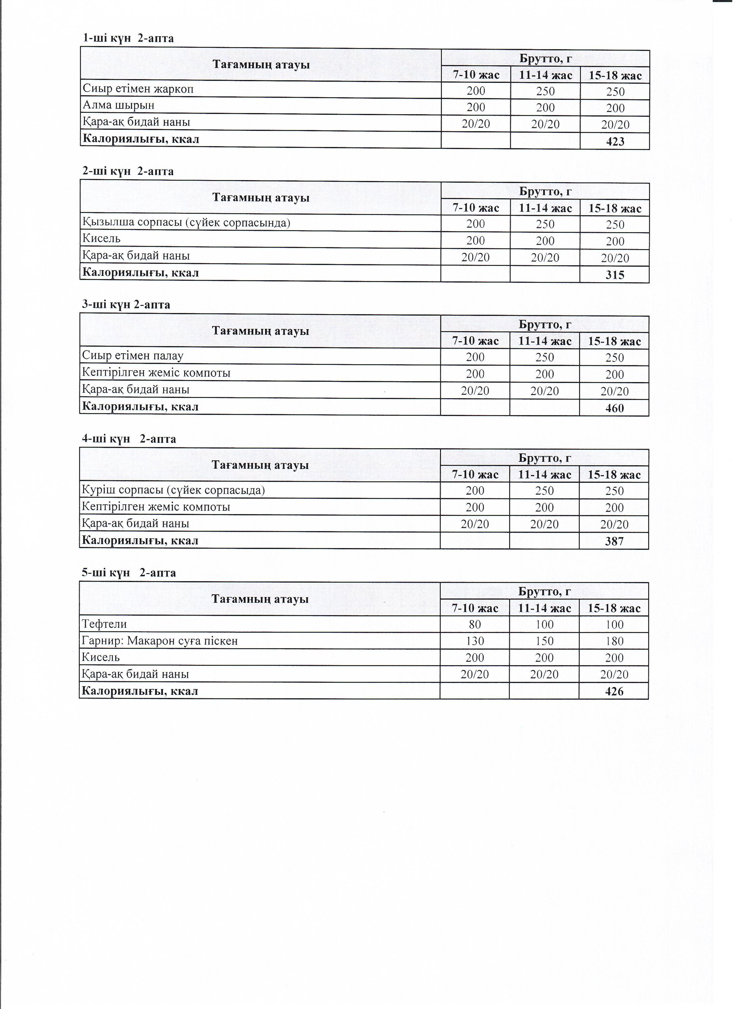 Орта білім беретін ұйымдарға көп балалы және аз қамтылған отбасылардан шыққан аса мұқтаж мектеп оқушыларының тағамын ұйымдастыруға 2019-2020 оқу жылына арналған екі апталық ас мәзірі